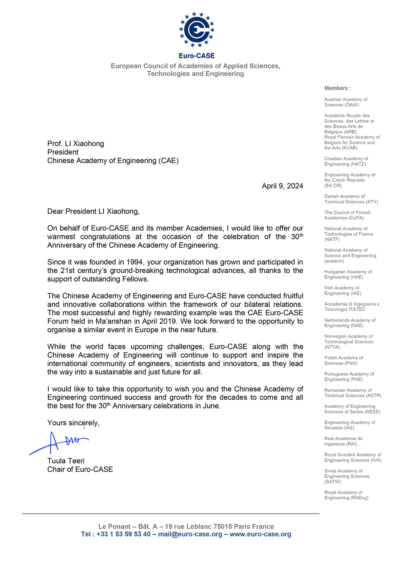 欧洲应用科学、技术和工程科学院理事会(EURO-CASE)贺信