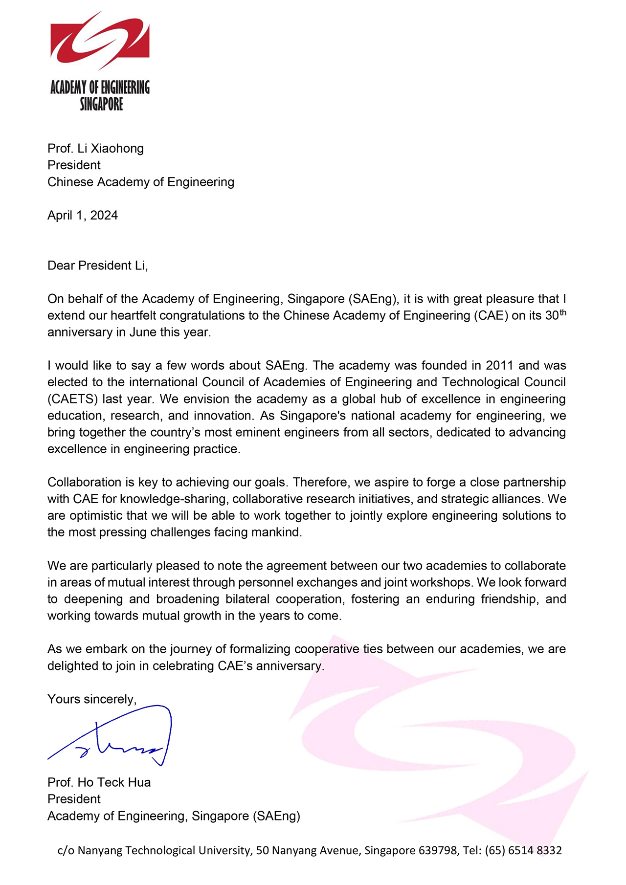 新加坡工程院贺信