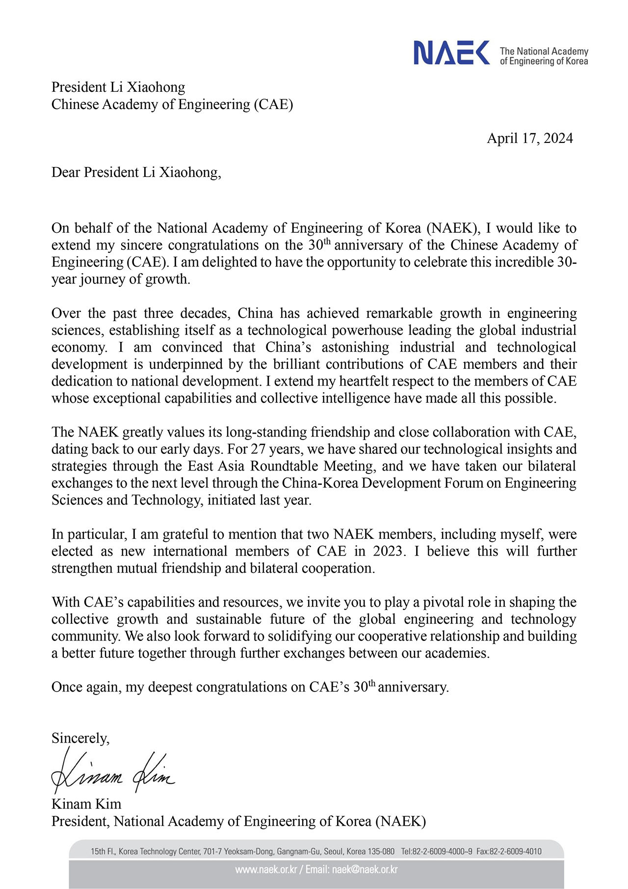 韩国国家工程院贺信