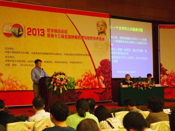 为促进我国抗肿瘤药物研究和应用的交流,增进对国际相关领域最新研究进展和动态的了解,由中国工程院医药卫生学部和中国抗癌协会抗癌药物专业委员会、中国药理学会肿瘤药理专业委员会联合主办,河南科技大学医学院、河南科技大学第一附属医院、河南省药理学会承办的 “2013医学前沿论坛暨第十三届全国肿瘤药理与化疗学术会议” 于2013年5月5日至9日在河南洛阳召开,中国工程院医药卫生学部丁健院士任大会主席,医药卫生学部甄永苏、郝希山院士、中国科学院张学敏院士出席会议。
