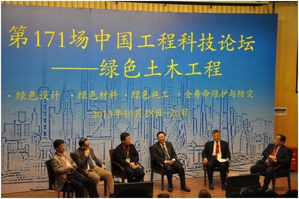 2013年10月19-20日,由中国工程院主办、土木、水利与建筑工程学部和同济大学土木工程学院共同承办的“第171场中国工程科技论坛——绿色土木工程”在上海同济大学召开。同济大学陈以一副校长主持了开幕式并致欢迎辞,中国工程院潘云鹤常务副院长、项海帆、崔俊芝、沈祖炎、范立础、江欢成、崔愷、缪昌文等8位院士、100余位相关领域专家以及同济大学吴志强副校长等近200位师生参加了论坛。