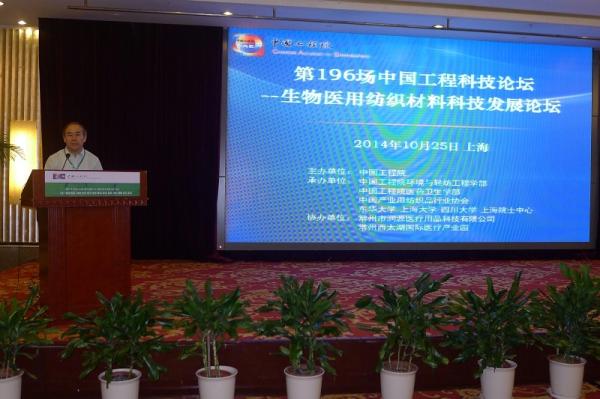 2014年10月25日,由中国工程院主办,中国工程院环境与轻纺工程学部、中国工程院医药卫生学部、中国产业用纺织品行业协会、东华大学、上海大学、四川大学、上海院士中心共同承办的“第196场中国工程科技论坛——生物医用纺织材料科技发展论坛”在上海市举行。来自中国工程院环境与轻纺工程学部的孙晋良、郁铭芳、周翔、蒋士成、姚穆、俞建勇院士和中国工程院医药卫生学部的王威琪、付小兵、胡盛寿院士、中国科学院化学部的颜德岳院士及来自相关部委、科研院所、高校及企业的170余位领导、专家、学者及企业技术人员参加了本次论坛。中国工程院刘旭副院长出席论坛并致辞。